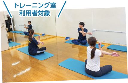 初めて利用する場合、初回者講習の参加が必要です(窓口または電話で要予約)。 スタッフから体育館利用のルールや、トレーニングマシンの使い方などの説明を受けます。 無料で参加できるミニプログラム20分程度で、トレーニング室利用者が参加できる無料のプログラムです(予約は不要、定員を超えた場合は抽選)。心身をリラックスさせるストレッチや、筋力維持を目的とした筋トレを教わることができます。
