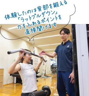 利用者の目的に沿って、負荷のかけ方や姿勢などマシンの具体的な使い方を教えてもらいます。レクチャーを受けながら、実際に体験できます。 マシンは全16種類!