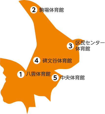 区内には、地区ごとに5つの体育館があります。休館日など詳細は、区ウェブサイトをご覧ください。