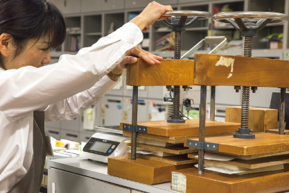 本が水にぬれた時は、ゆがみが生じないように、締め機でプレスして乾かします