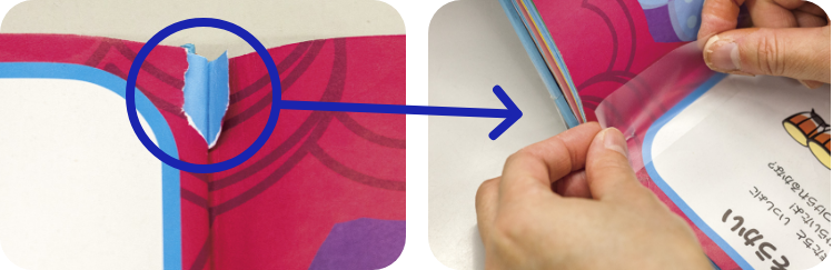 ページの破れや、ノド(ページをとじている部分)割れは、ヘルパーと呼ばれる透明のテープで補修します
