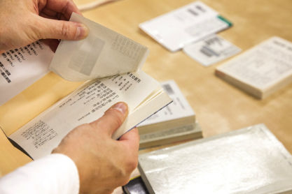 状態が悪い本は処分します。そのために、皮はぎ(フィルムカバーの不燃ごみ部分と、本体の古紙部分を分ける)して分別します。