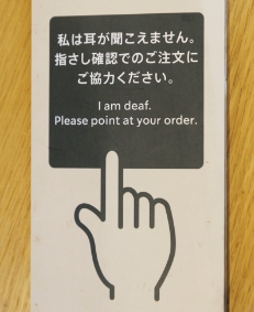 お客さんにジェスチャーで耳が聞こえないことを示し、注文はメニューを指さしてもらうよう促します。