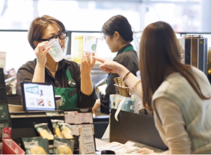 聴覚に障害があることを知らせるためにエプロンに付けたバッジやカードを示すことで、お客さんの協力を得ています。