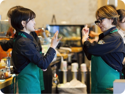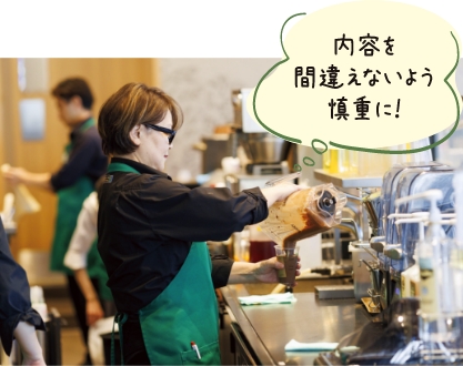 「ライトホット(ぬるめ)」などの注文は店で決めてあるサインで、他のスタッフと伝え合います。