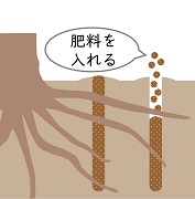 固くなった土壌に穴を掘り、ノズルで空気を送り込むことで土壌を柔らかくして根の呼吸や成長を助けるとともに、穴に土壌改良剤や肥料を入れ、根の健全な生育を促します。