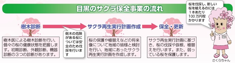 目黒区内の桜は、老齢化や環境の変化による樹勢の低下や倒木・枝折れなどが懸念されています。