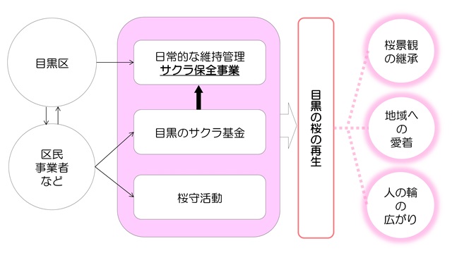 目黒区内の公園や緑道、道路緑地などには約2,100本の桜がありますが、老齢化や環境の変化により、樹勢の低下や倒木などが懸念されています。桜の保全や更新の取り組みが必要となっていることから、目黒区では平成26年3月に目黒のサクラ基金を設立し、皆様からいただいたご寄付を活用して目黒の桜の風景を後世に伝えていくため、「めぐろサクラ再生プロジェクト」として目黒のサクラ保全事業や桜守活動の支援を行っています。