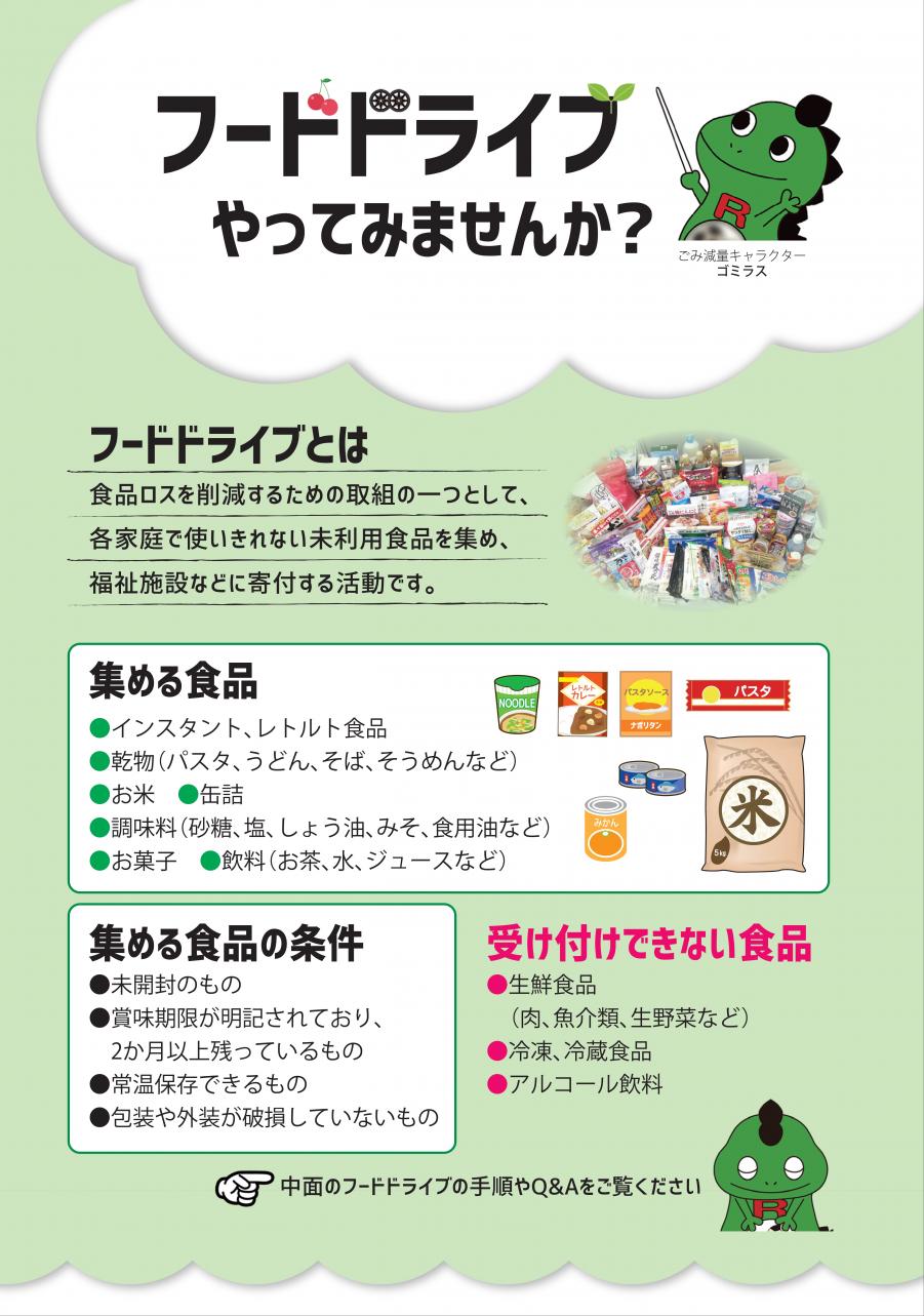 この食品ロスを削減する取組となるフードドライブ活動(家庭で余っている食品を集め、福祉団体や施設、フードバンクなどに提供する活動)を支援するため、実施する団体・事業者のかたに対して、物品の貸出を行っています。