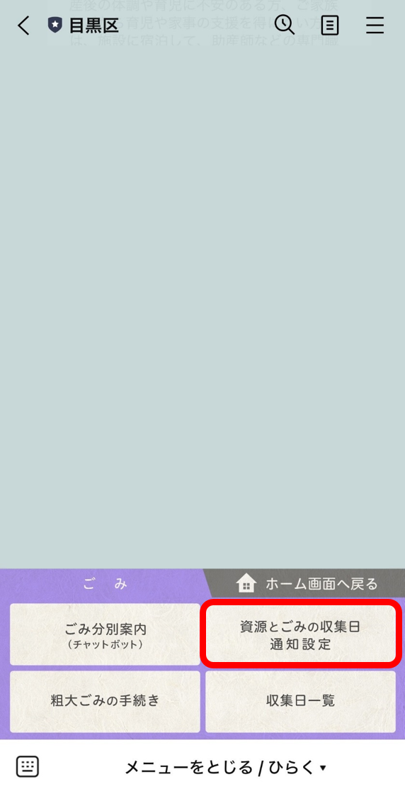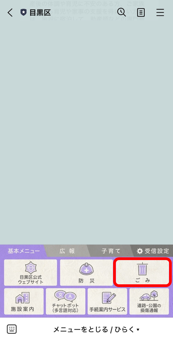 (1)目黒区LINE公式アカウントの画面下にあるメニューから、「ごみ」をクリックします。