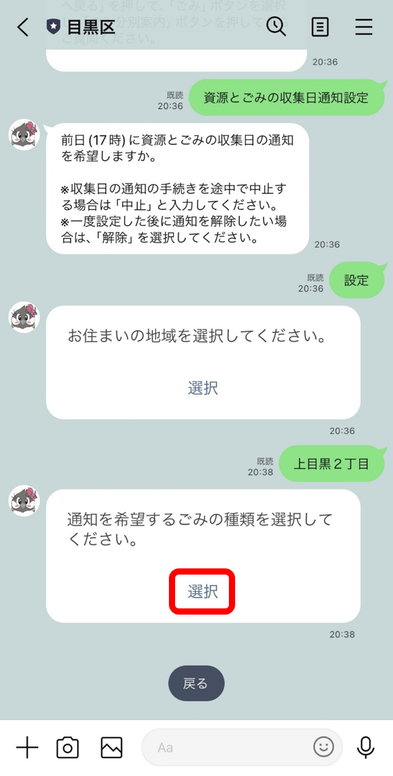 (8)「通知を希望するごみの種類を選択してください。」というメッセージに表示されている「選択」を押します。