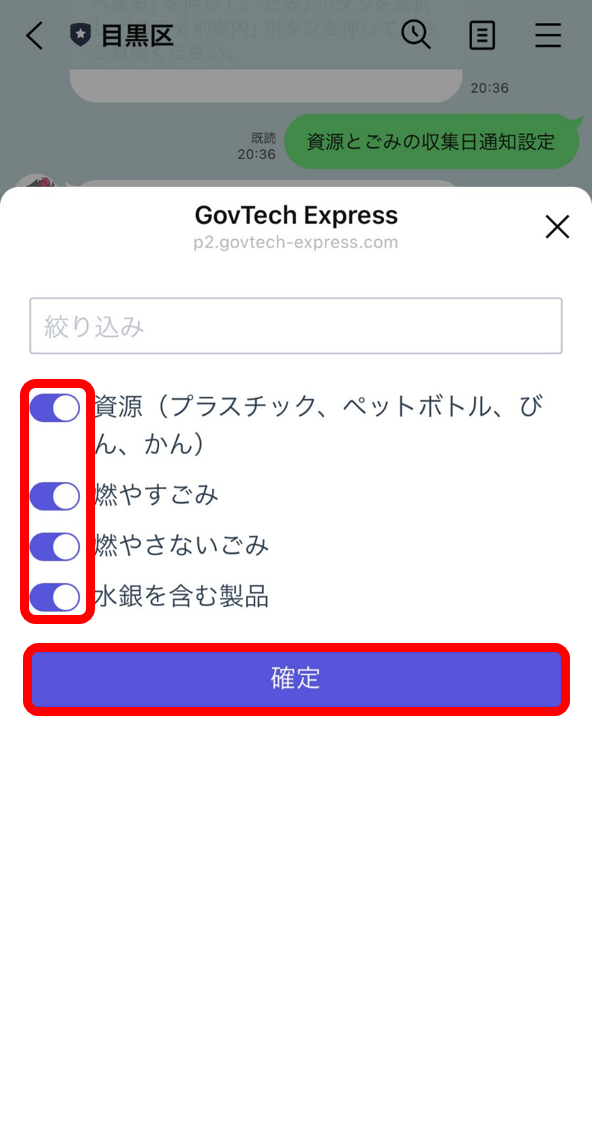 (9)通知を希望するごみの種類を選択し、「確定」を押します。
