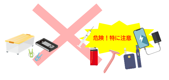 - モバイルバッテリー、電子・加熱式たばこ、スマートフォンなど(小型充電式電池を内蔵しているもの)