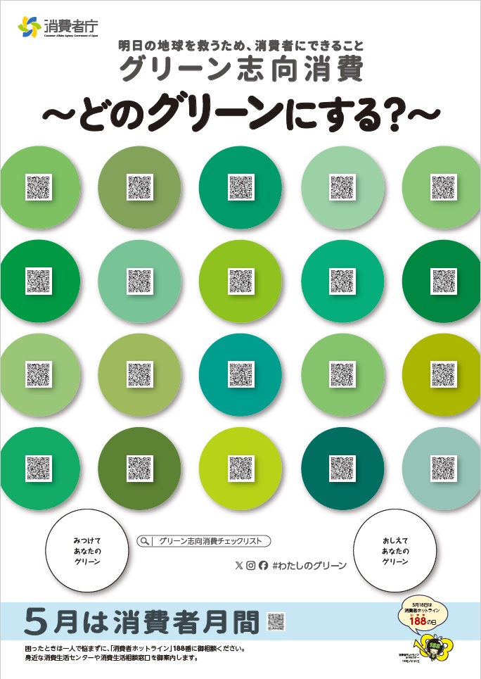 令和7年度の消費者月間においては、「明日の地球を救うため、消費者にできること グリーン志向消費 どのグリーンにする?」が統一テーマになっています。さあ、みんなで地球を守る消費行動を始めましょう!