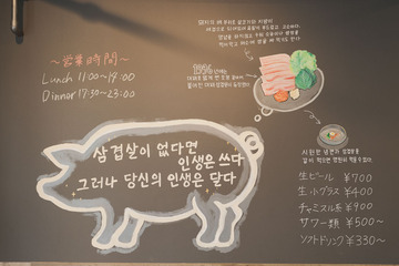 韓国料理のお店には見えないカフェのような雰囲気の内外装は以前、ここが以前ケーキ屋さんだったものを十二分に活用したもの。カップルや家族、友人で楽しめるテーブル席に加えて、学生がひとりでも気軽に来店できるように韓国料理店にしては珍しいハイチェアのカウンター席も。壁面には「サムギョプサルのない人生は辛い。だけど今のあなたの人生は甘い。」といった”名言”や韓国チキンの食べ方などが韓国語で書かれ、店内をあたたかに彩っています。店名は韓国語で「パクさんの食堂」の意味ですが、パクさんとは渋谷さんの奥様の名前。ここに、お店のコンセプトのすべてが表れているようです。
