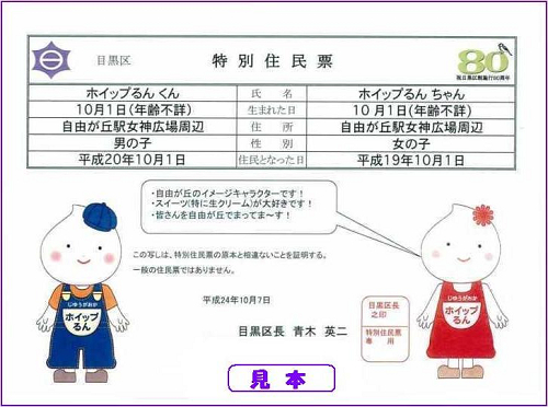 平成24年10月7日自由が丘女神まつりにおいて、自由が丘のイメージキャラクター「ホイップるん」に目黒区特別住民票を交付しました。
