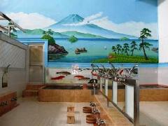 ペンキ絵と「マイナスイオン」の大きなお風呂。さわらの桶は音がいい。