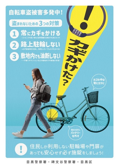 目黒区では、令和2年3月に「目黒区自転車の安全な利用の促進に関する条例」を制定し、自転車利用者の責務として、自転車の施錠等に努めることを定めています。目黒区を「安全で安心して暮らせるまち」とするため、今一度、皆さんの防犯意識を高めていただき、自転車を止める場合は、自宅の庭やマンションの駐輪場など自宅敷地内であっても、また、店先等の駐輪スペースへの短時間の駐輪であっても、決して油断することなく、必ず鍵をかけるようにしましょう。