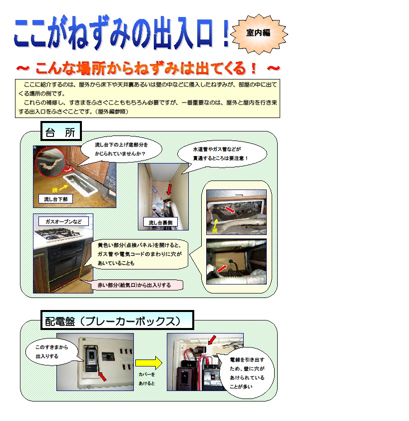 室内への侵入口は、壁や床にできた隙間や配管周りが多いようです。特に台所の流し台周辺は、水道・ガス・排水管などが、多数壁を貫通しているため、よく侵入口が見つかります。また、かまち(玄関の土間の奥)、エアコンの裏側、配電盤(ブレーカーボックス)の内部、和室の長押の内側なども気が付きにくいところですが、重要な箇所です。