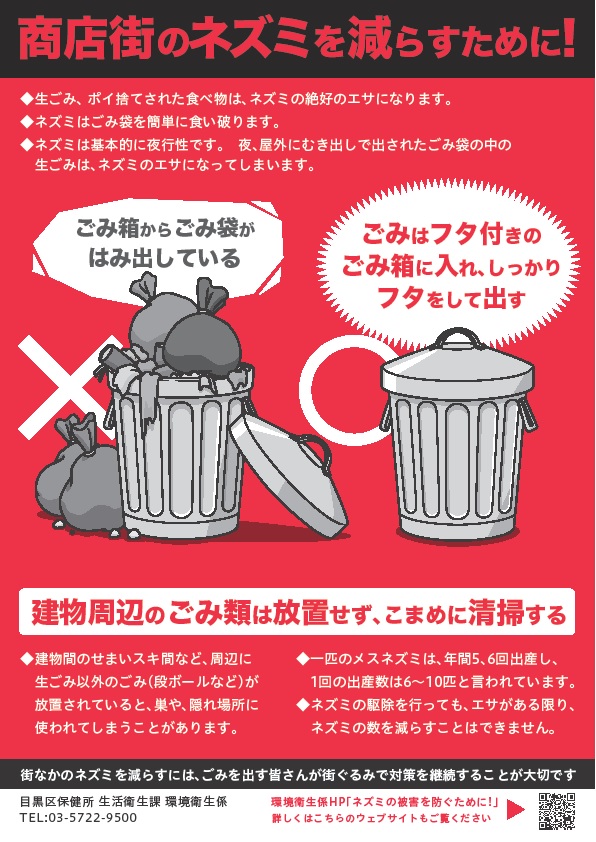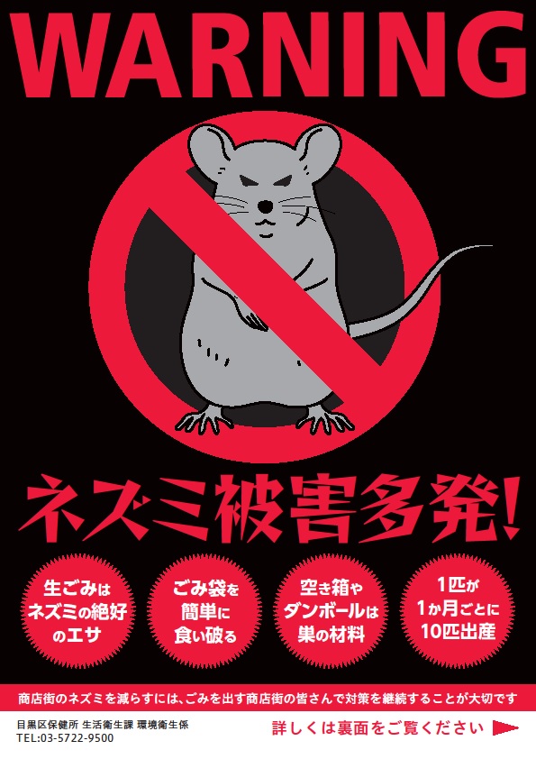 目黒区内の住宅地で、家屋内に侵入してくるものは、ほとんどがクマネズミのようですが、繁華街などではドブネズミの姿も見かけます。また、ハツカネズミは、あまりみられなくなりました。