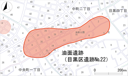 油面遺跡(あぶらめんいせき)は大正時代から土器や石器が多く採集できる場所として知られていた縄文時代の集落遺跡です。昭和10年に付近に住んでいた松宮氏によって発掘調査が行われ、この時に採集した土器などが調査記録の一部とともに目黒区に寄贈され残されています。近年の調査では、縄文時代の竪穴住居跡(たてあなじゅうきょあと)が20軒発見されており、縄文時代中期(約5千年前から4千年前まで)を中心とした集落遺跡であることが分かってきています。
