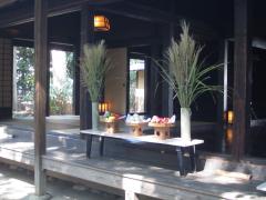 古民家の縁側に、すすきの穂や里芋・栗・団子などを供えます。