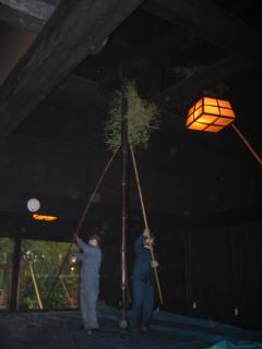長い竹の先に笹をつけて屋根裏や梁(はり)にたまった1年分の汚れを落とします。