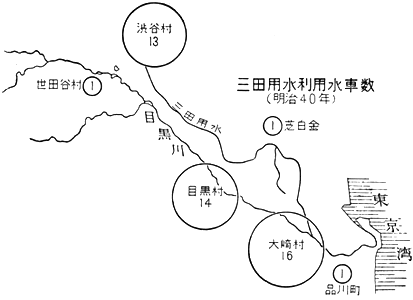 この三田用水は、灌漑(かんがい)や米をつく水車に利用されることになったが、世田谷領下北沢村で玉川上水から3尺四方の樋口で分水して、代々木、中渋谷、上目黒、中目黒、下目黒、三田、白金、大崎などの各村を通り、延長2里余りで、現在の五反田付近から目黒川に注いでいたと伝えられる。
