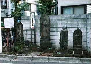 複数ある庚申塔のうち、一つは区内でも珍しいお地蔵様を彫ったもの。この碑の向かって右隣にあるものは猿が1面に1匹ずつ彫られています。この庚申塔はもとは屋根付きでしたが屋根の部分は下に落ちてしまっています。