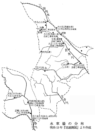 幕末から明治初期までに、区内の用水や川にも次々と水車が作られた。水力を利用して、米をつき、粉を挽いたのである。精白米は、商品として売るほか、一部は濁酒醸造に回されていたようである。広がる田畑、うねる川、そして水車の回る音。のどかな風景が想像されるが、当時の農民たちにすれば、大問題であった。