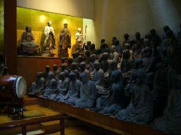 本尊の釈迦如来は像高356センチメートル、五百羅漢は像高78.1から90センチメートル、すべて寄木造(よせぎづくり)です。漆箔の像で、大多数は眼を彫り出しています。ほとんどの像を松雲元慶(しょううんげんけい)禅師(1648年から1710年)が彫刻しました。