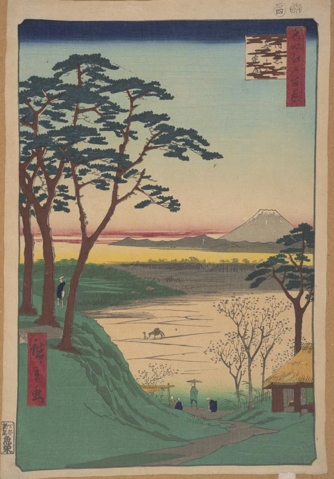 目黒に題材を求めた広重(ひろしげ)の浮世絵には、富士山崇拝のため築造された元富士、新富士を手前に配し、はるかに本物の富士山を望む構図が幾つも見られる。江戸庶民にとって、目黒は富士山を眺めるのに格好の景勝地だったのだろう。