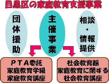 目黒区教育委員会が行っている家庭教育支援事業は、主催事業、団体援助、相談・情報提供の三つに区分されています。