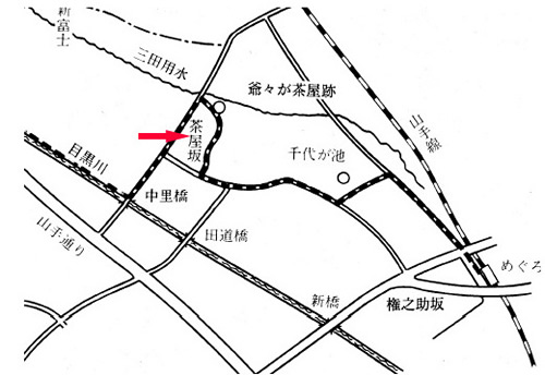 江戸時代、坂の上に茶屋があったことに由来する「茶屋坂」からは富士の眺めが良く、茶屋も大いに繁盛していたようです。目黒に鷹狩にやってきた将軍がよく利用してたといわれ、「爺々(じじ)が茶屋」と呼ばれていました。