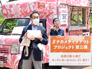 本日は、ナカメテイクアウトプロジェクトのご紹介をさせていただきたいと思います。今、私は中目黒の目黒川船入場にあるこの広場にお邪魔をしています。現在、この場所で新型コロナウイルスの影響を受けている飲食店の皆さんを少しでもバックアップしようと、中目黒の地元で街づくりを進めていらっしゃる、一般社団法人中目黒駅周辺地区エリアマネジメントの皆さんがこのキッチンカーを使って、飲食の販売の支援を実施されています。