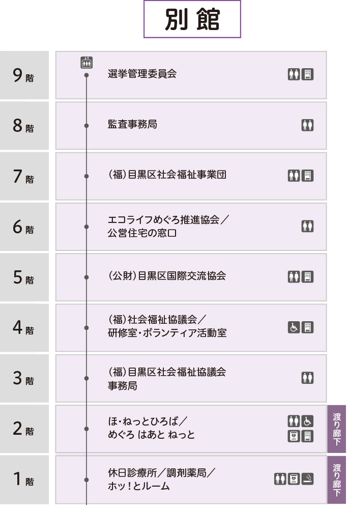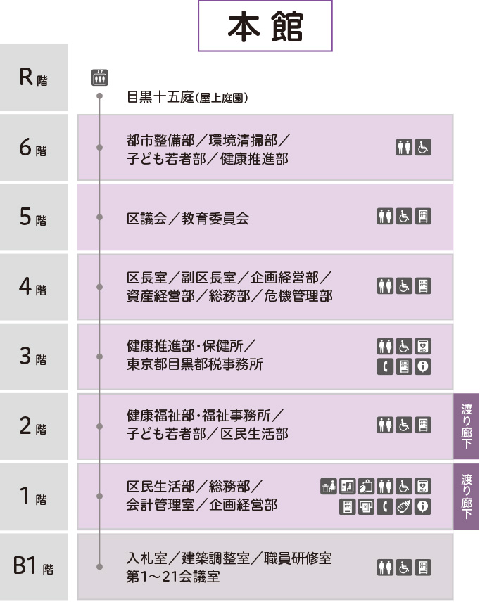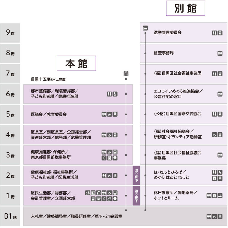 保健所、目黒都税事務所を加えた総合庁舎です。庁舎内には多くの施設があり、閉館日や開庁時間が異なりますので、各施設にお問合せください。