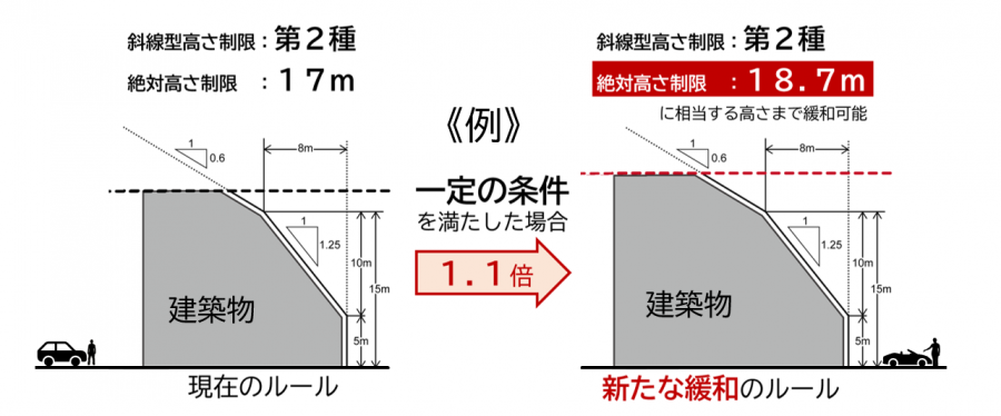 なお、この緩和は第一種低層住居専用地域を除く全ての高度地区の指定がされている地域が対象です。