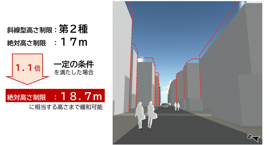 一定の条件を満たしている建築物のみ、1.1倍、つまり、10パーセント建物の高さを緩和するルールです。 一定の条件(いずれか1つ以上) 空間
