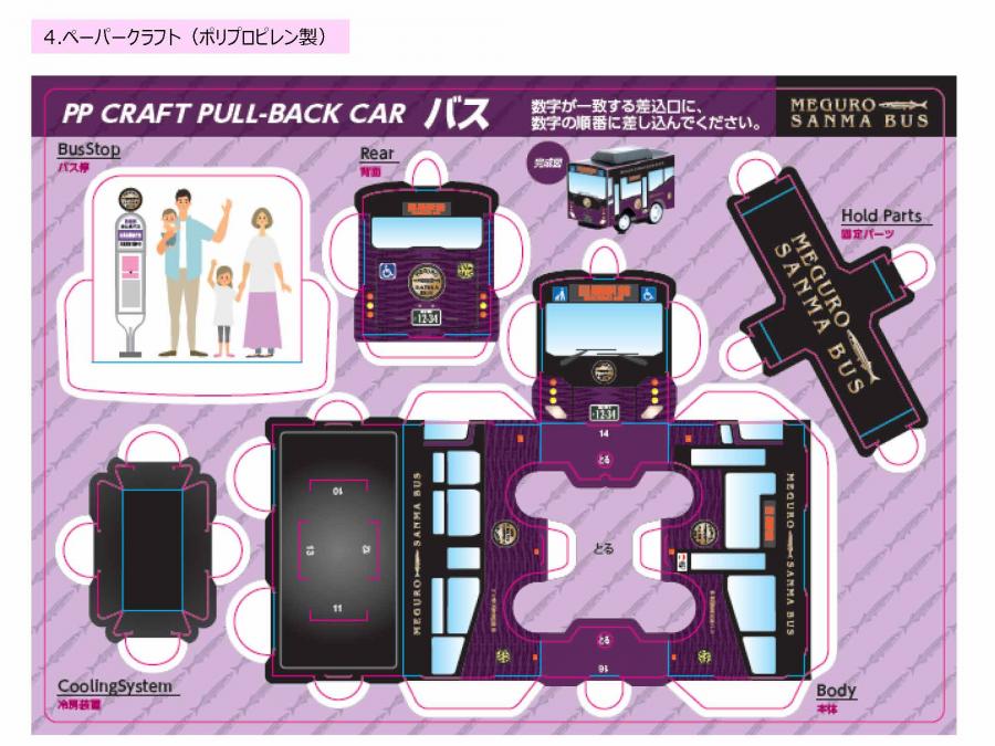 記念品として、車体ラッピングやバス停のロゴマークを使用したコースターやステッカー、さんまバスペーパークラフトプルバックカーをお送りします。