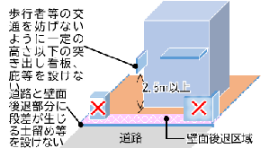 道路境界線から、0.5メートル以上の壁面後退が必要になります。 - (2)隣地境界線からの壁面後退
