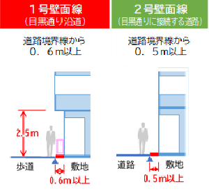 目黒通りの歩道面からの高さが2.5メートル以下の部分について、道路境界線から0.6メートル以上の後退が必要になります。 - (2)2号壁面線(目黒通りに接続する道路)