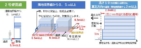 隣地境界線から、0.5メートル以上の壁面後退が必要になります。 - (3)高さが10メートルを超える部分についての壁面後退