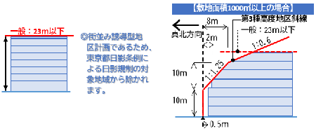 注記:(2)の敷地面積2,000以上の場合の高さの緩和を適用するには、区長の認定が必要になります。詳しくは建築課へご相談ください。
