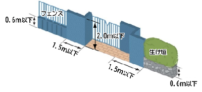 - 道路に面する垣やさくの構造は、生け垣やフェンス等にする必要があります。