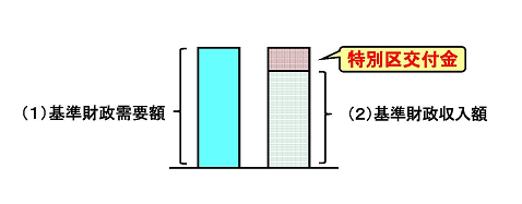 特別区交付金は、下図のとおり、人口などの区の規模に応じて必要なサービス量を積み上げた基準財政需要額(1)と、特別区税の一定割合などを積み上げた基準財政収入額(2)との差額が交付されます。
